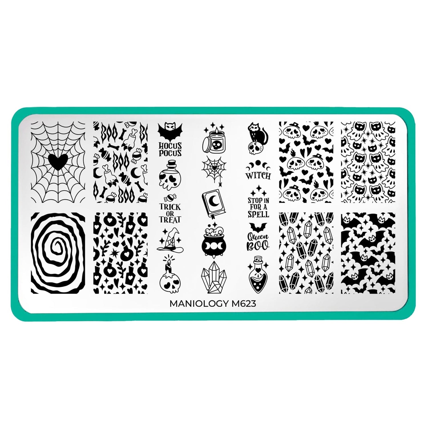 Get into the spirit of wicked nail magic with the Spellbound stamping plate. This plate wraps your nails under a mystical enchantment with bubbling cauldrons, dusty spellbook, potion bottle, witch hat, black cat, fluttering bats, and wisps of spells. It creates a spooky, magical, yet moody vibe perfect for Halloween or witchy nails any day. Ready to brew up some spellbound nail art? Summon your best-dressed spell and create your very own Halloween look!