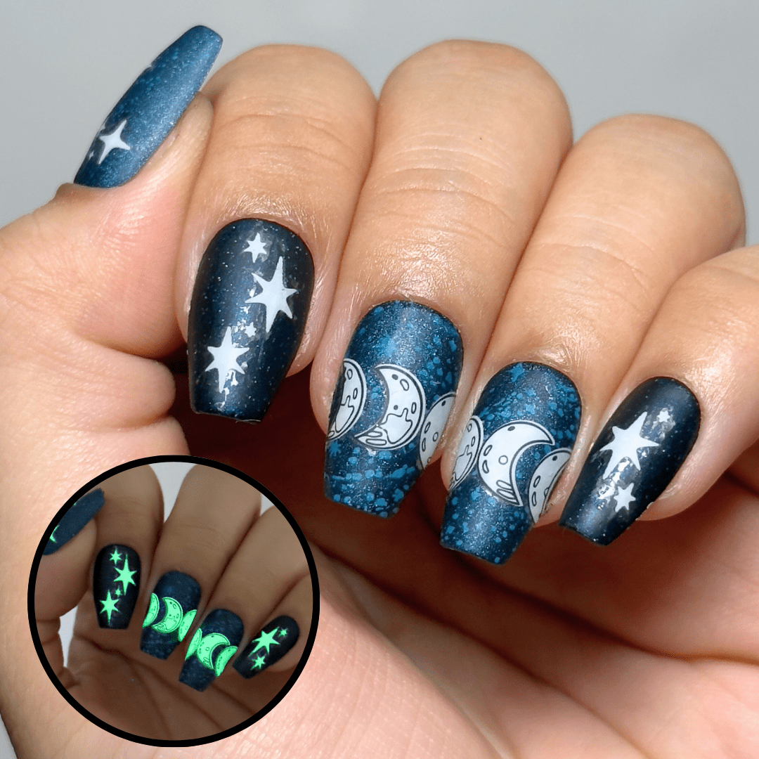 Our Star Struck Nail Art Stickers glow in the dark with twinkling stars, crescent moons, and celestial sparkles that make your nails shine like the night sky. Each design is printed with high quality ink and pliable materials to hug the natural curve of your nails. The ultra thin backing creates seamless designs on the nail bed, so you won't have to worry about raised edges. Perfect for Halloween, spooky nights, stargazing vibes, or just a fun glowing twist to your mani.