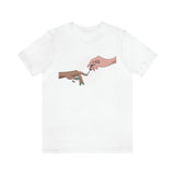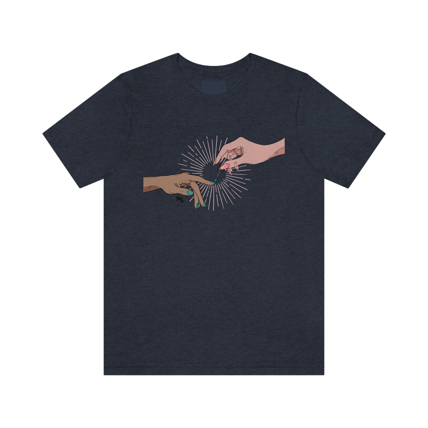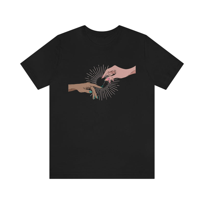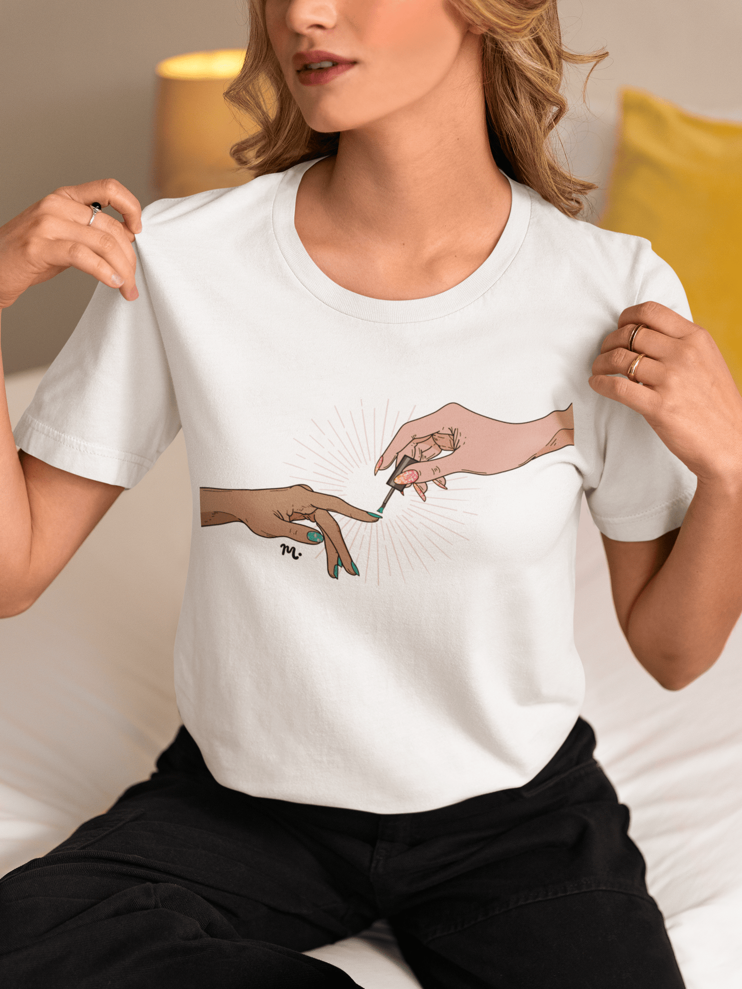 Let there be nail art. The "Creation of Manicure" design embodies those first heavenly moments of nail art creation. The artist breathes life into the manicure with a miraculous drop of polish. This shirt features a design that perfectly captures the power of creativity and the beauty of nail art. With its soft and comfortable fabric, this tee is perfect for any casual occasion, from lounging at home to a day out. Wear it for a boost of confidence, style, and inspiration every day!