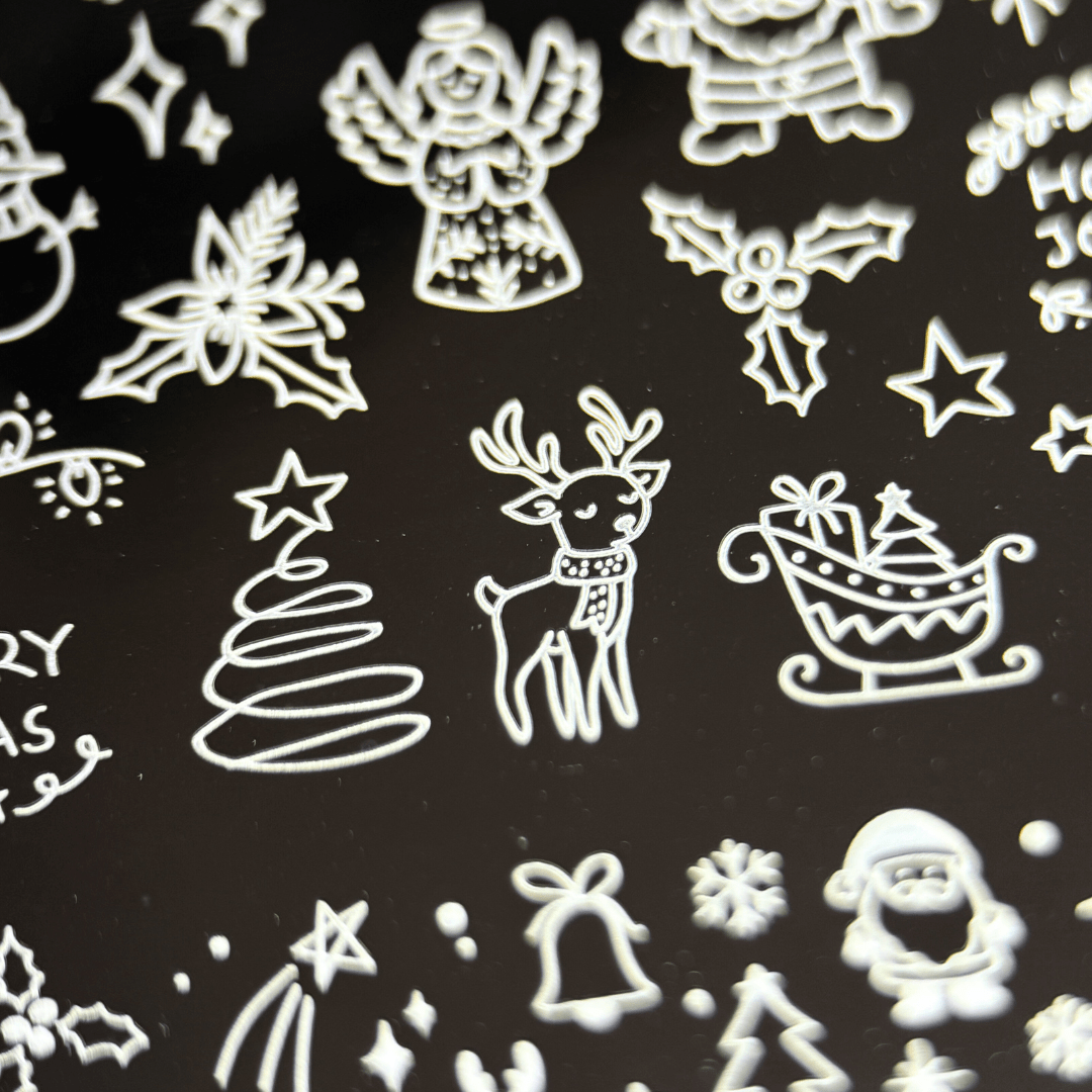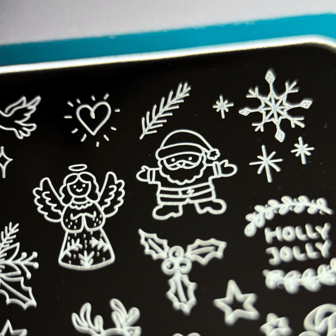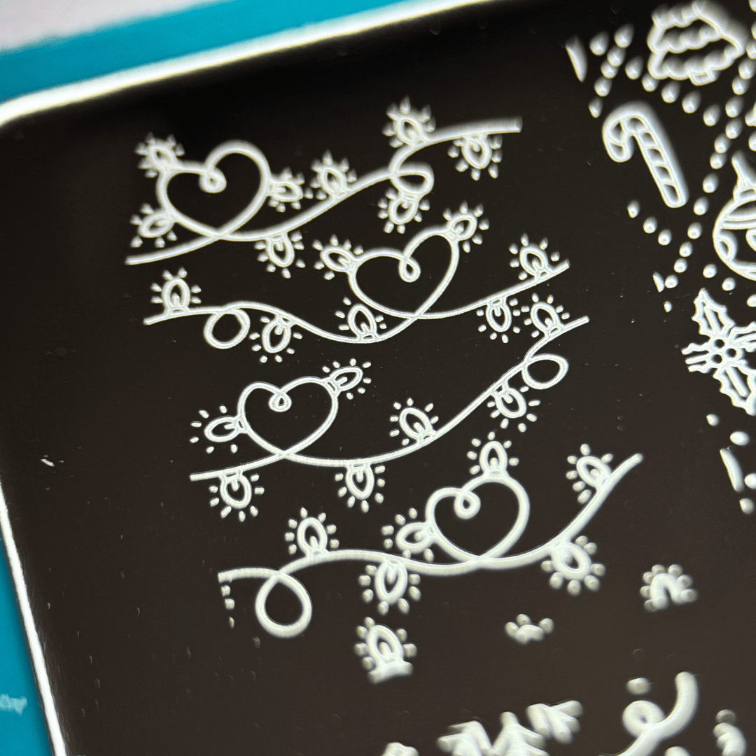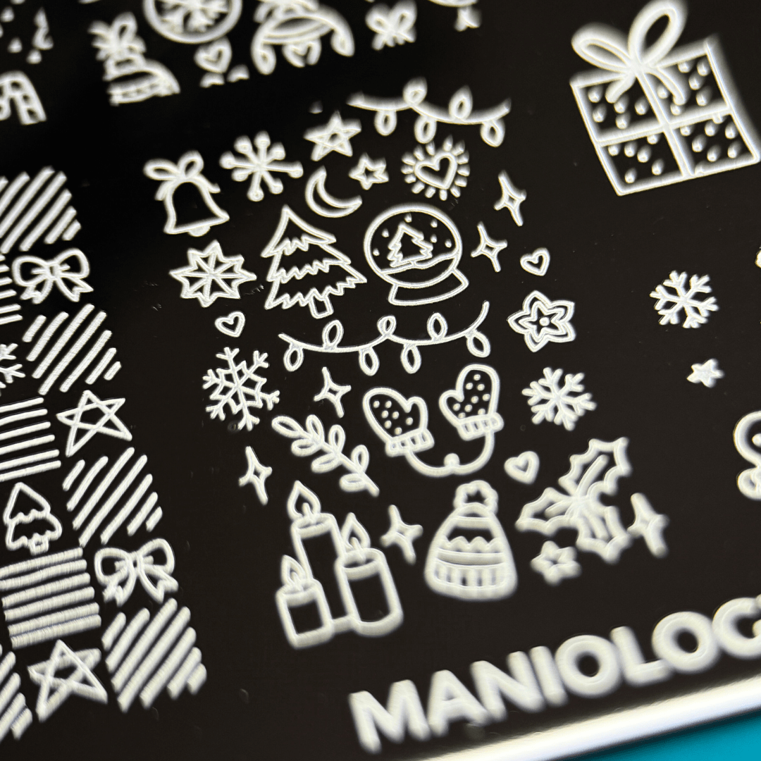 Create magical holiday nails with Twinkling Trinkets (MXM163). This plate features a flurry of hand-drawn patterns, including garlands, snowflakes, ornaments, and festive flourishes. From tiny accents to full nail patterns, every stamp adds seasonal charm.