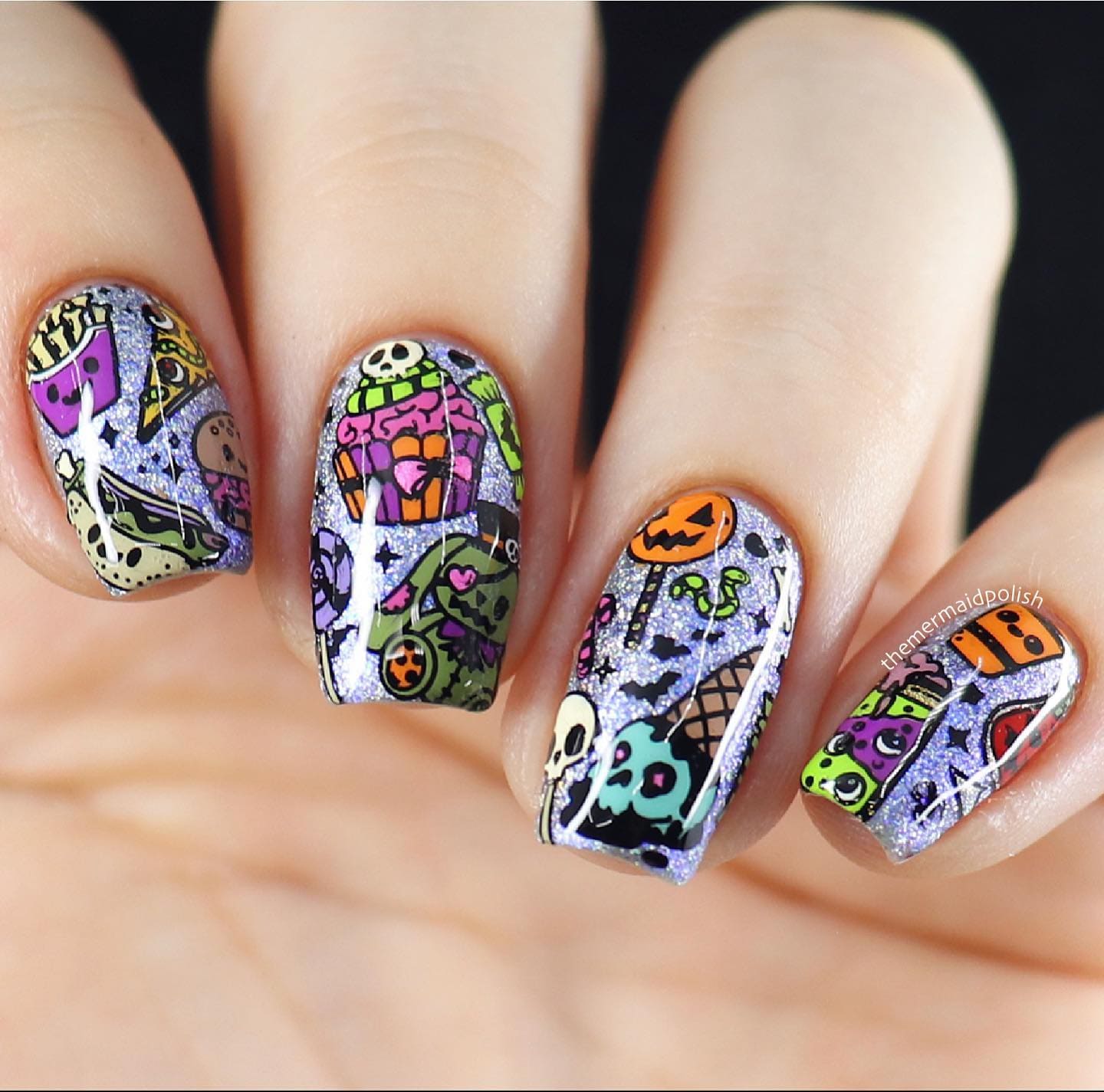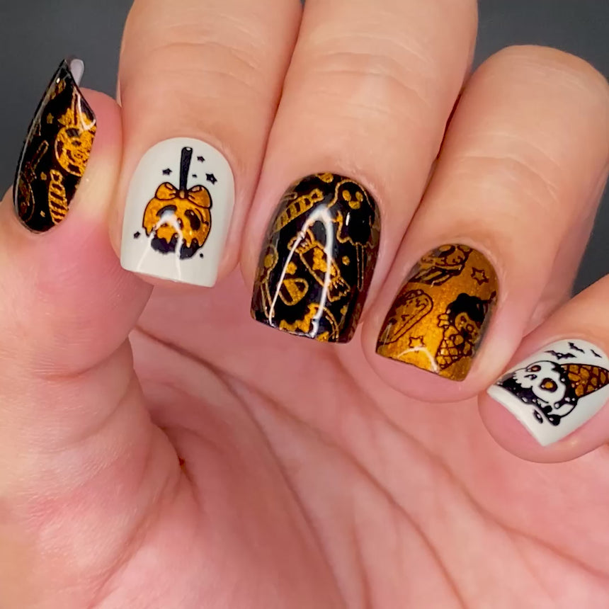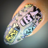 Sweetness meets spookiness in this tantalizing Halloween feast for your nails! Our Treats & Trinkets stamping plate offers the tastiest and eeriest treats and trinkets! Indulge your cravings with a bewitching assortment of candy, sweets, and treats that will leave your nails looking utterly delightful! But beware, amidst the sweets and treats, there's a sprinkle of spine-tingling surprises, lurking around, adding a dash of fright to your nails.