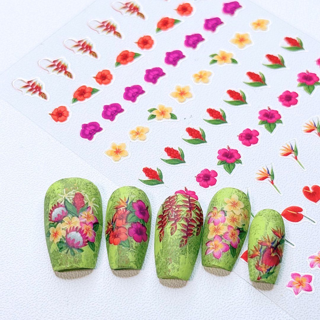 Turning every mani into a tropical escape, Tropic Crush is a bouquet of bright blooms, featuring hibiscus, heliconia, strelitzia, orchids, and more, all bursting with vibrant summer color and lush island vibes. Each design is printed with high quality ink and pliable materials to hug the natural curve of your nails. The ultra thin backing creates seamless designs on the nail bed, so you won't have to worry about raised edges. Fresh-picked florals, minus the wilt. Stick on these blooms and let your nails bloom too!
