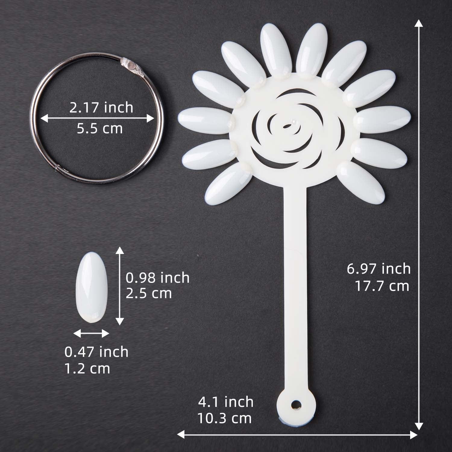 Mess-free and easy-to-use! Display your favorite nail polishes with our Polish Swatch Wheels. This tool features a flower-shaped design and comes in three colors to choose from—black, white, and transparent. These are perfect for swatching your polish collection on different base colors, displaying your nail designs, and practicing nail art. Each set comes with 10 swatch wheels, featuring 12 nail tips, and a metal ring holder to keep everything in place.