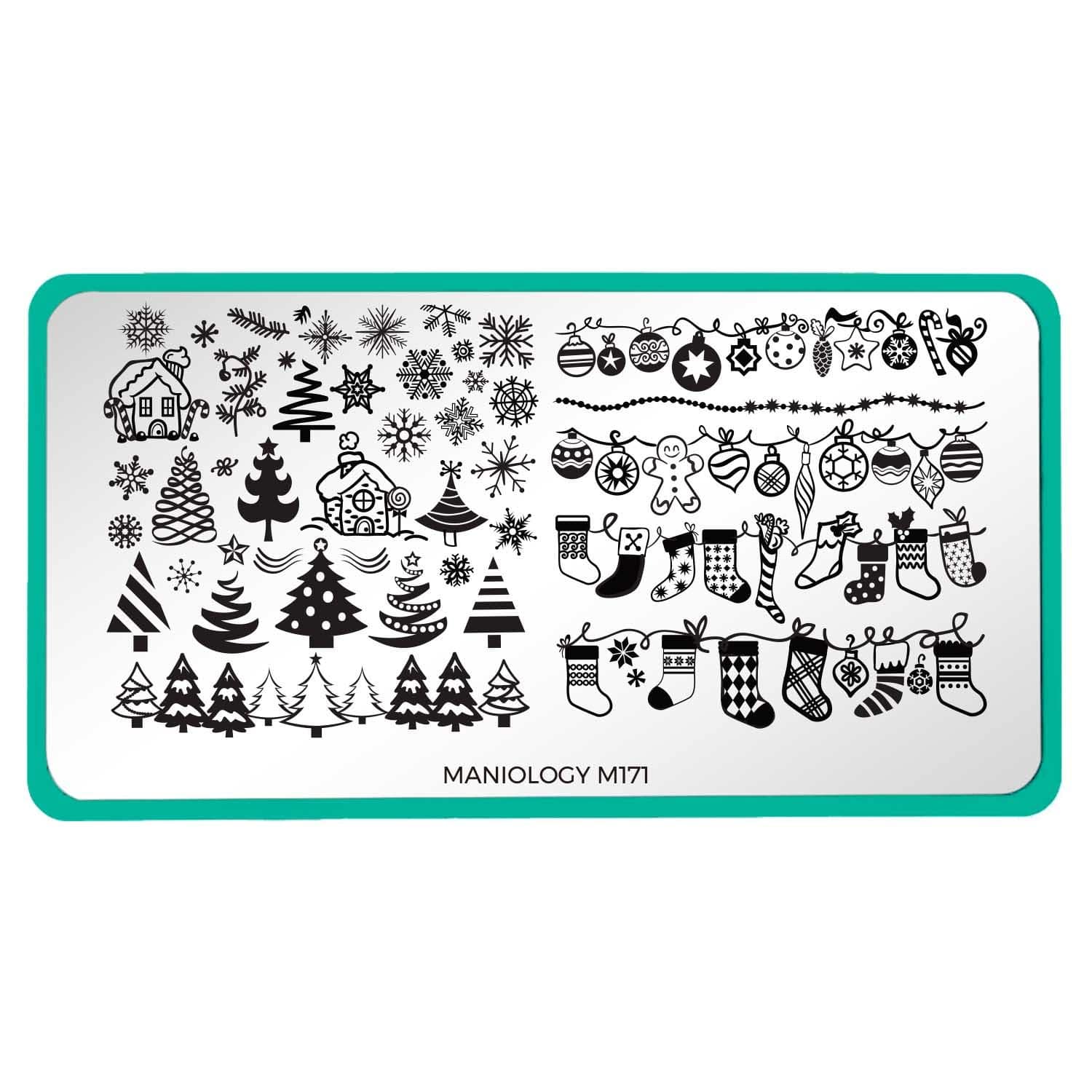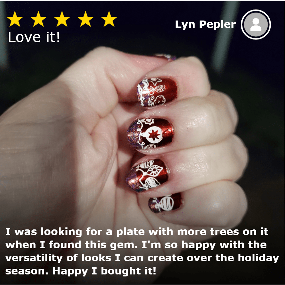 The stockings are hung, and the tree is lit. It's time to warm those fingertips with a new manicure. This holiday revamp features 2 of our classic square plates from the Winter Occasions collection. Relax by the fireplace while enjoying 2 buffet style designs with a winter forest scene, festive garlands, sparkling ornaments, and cozy stockings. This XL revamp plate will bring you merry designs to enjoy all winter long.